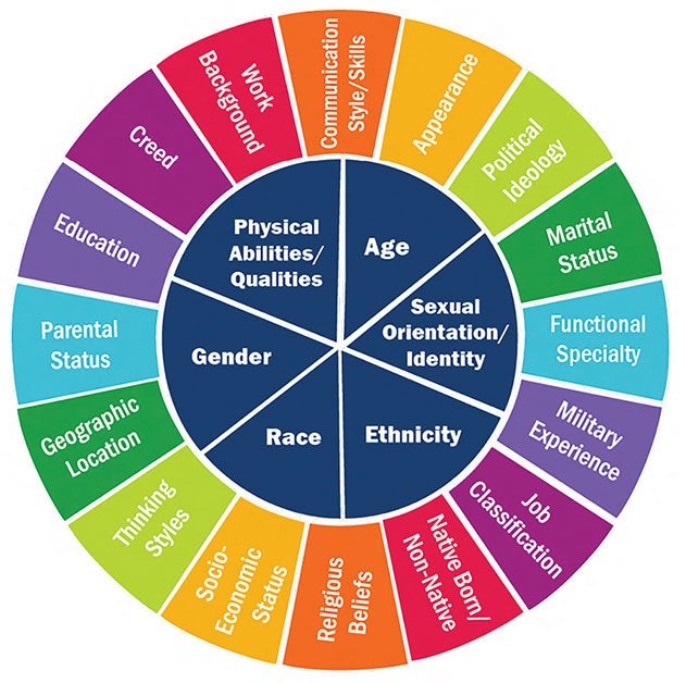 Look at this identity wheel – it shows dozens of different aspects that contribute to who we are: age, gender, race, ethnicity, education, geographic location, work background, thinking styles, political ideology, religious beliefs, and many more.